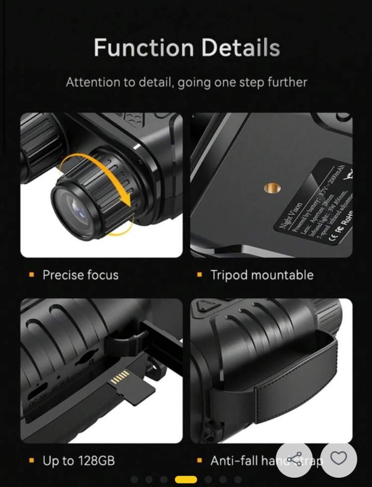 ★ رؤية واضحة في الظلام: يتميز منظار الرؤية الليلية الرقمي بالأشعة تحت الحمراء بتقريب رقمي 10x و7 مستويات لضبط الأشعة تحت الحمراء، مما يتيح رؤية واضحة حتى مسافة 0.5 متر إلى 800 متر في الظلام الدامس، ومن مسافة 0.5 متر إلى ما لا نهاية في الإضاءة الخافتة. يمكنك التقاط صور ومقاطع فيديو بدقة 1920*1080 بكسل، مع بطاقة ذاكرة 32 جيجابايت. ★ شاشة العرض: مناظير رؤية ليلية للبالغين بشاشة عالية الدقة مقاس 2.8 بوصة، تتيح لك مشاهدة صور ومقاطع فيديو فائقة الوضوح. مثالية للتخييم، ومراقبة الحياة البرية، والصيد، والتكتيكات العسكرية، أو الاستكشاف الليلي.